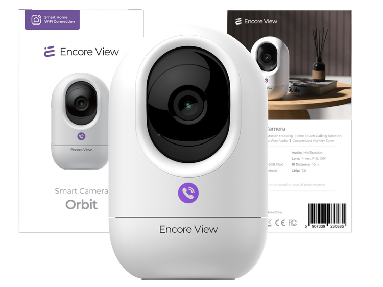 Inteligentní kamera Encore View pro použití v interiéru, ovládaná aplikací. Zařízení typu PTZ s funkcemi jako sledování pohybu, hlasové spojení jedním tlačítkem, nočním IR dohledem do 10m. Kabel, nabíječka a montážní prvky jsou součástí balení.