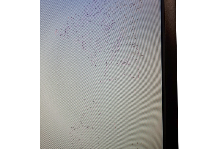 Monitor z druhé ruky. Má na mnoha místech vyteklý displej. Fotografie příkladného kusu.