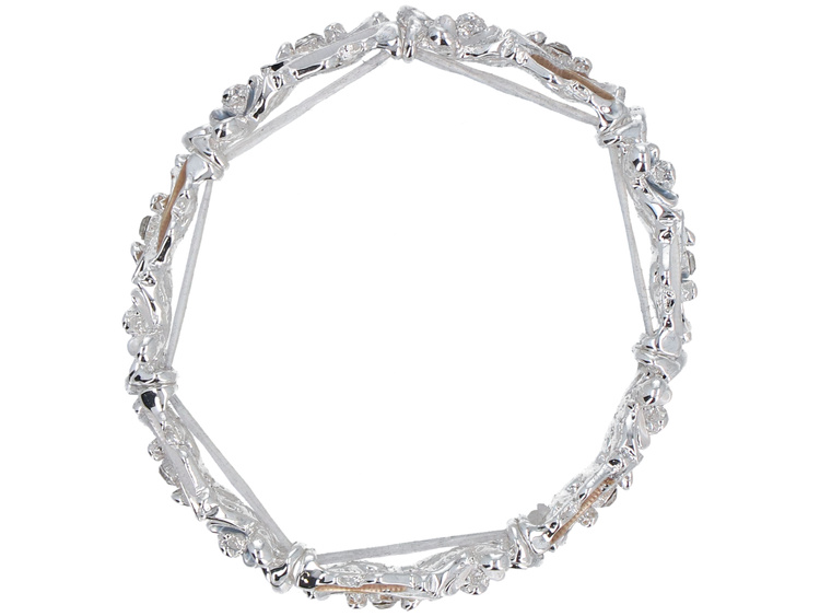 Elastický náramek ve stříbrné barvě, složený ze segmentů ve tvaru květin a motýlů, se žluto-šedo-bílým výplní ve stylu smaltu. Je to okouzlující a univerzální doplněk, který dodá lehkost a barevný akcent každé stylizaci.