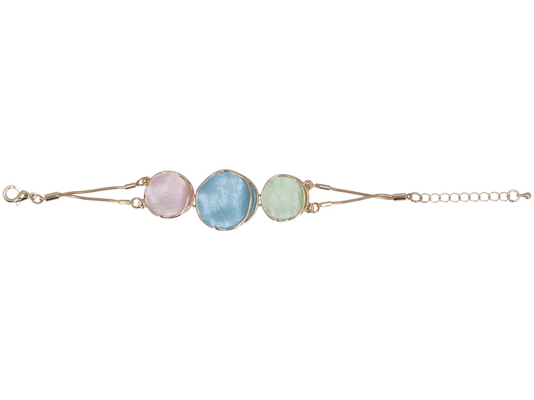 Elegantní náramek ve zlatém a perlovém odstínu, zdobený třemi efektními, nepravidelnými prvky v rámu připomínajícím ručně tvarovaný umělecký šperk. Zapínání na dvojitou řetězovou s regulací pro dokonalé přizpůsobení.