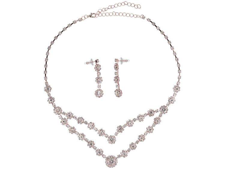 Sada šperků v barvě růžového zlata. Náhrdelník ve vrstvené formě a náušnice na puzety, zdobené lesklými zirkony uspořádanými do růžic připomínajících drobné květiny. Sada, která dodává stylizaci eleganci v romantickém vydání.