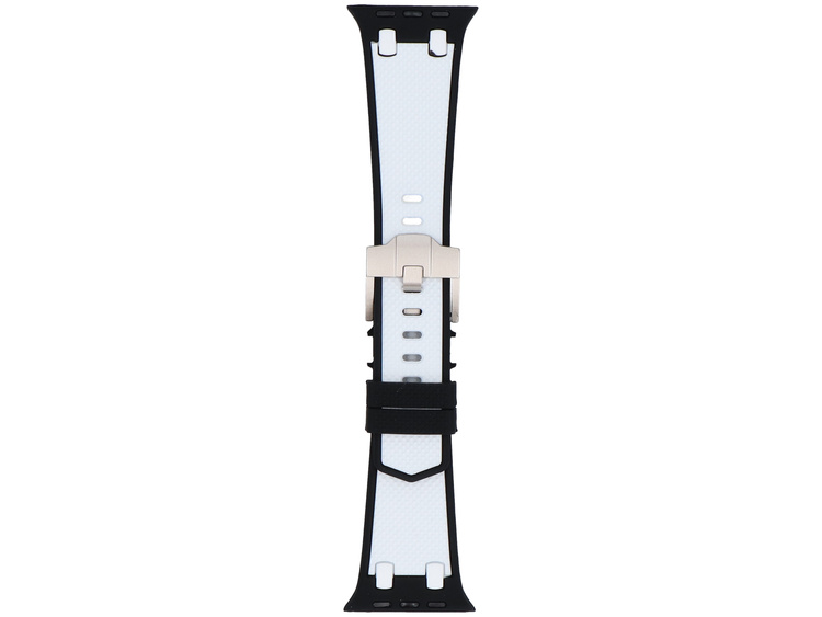 Silikonový pásek GlacierX, určený pro Apple Watch 42/44/45/49mm, s klasickou sponou v barvě stříbrné. Bílá-černá, s výraznou textilní strukturou.