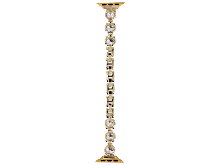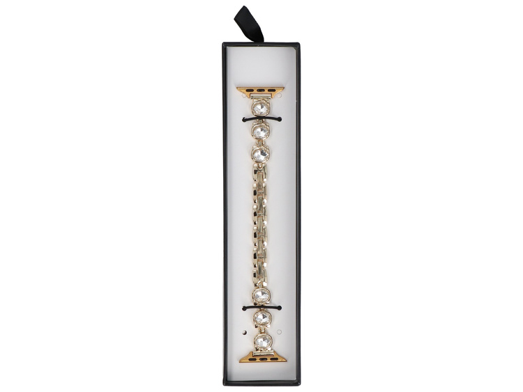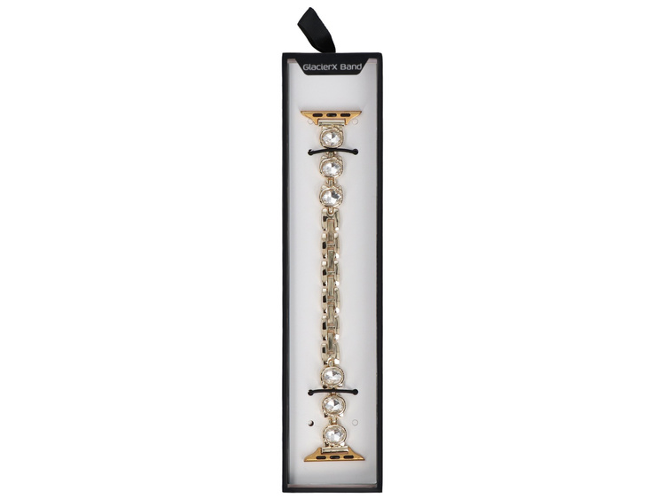 Řetízkový náramek GlacierX určený pro Apple Watch 38/40/41mm. Barva zlatá, zdobený zirkony. Délka nastavitelná pomocí rozepínacích článků. Produkt nový, zabalený v originálním obalu.