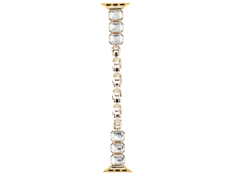 Náramkový řetízek GlacierX určený pro Apple Watch 38/40/41mm. Barva zlatá, zdobený zirkony. Délka nastavitelná pomocí čtyř rozepínacích článků. Produkt nový, zabalený v originálním obalu.