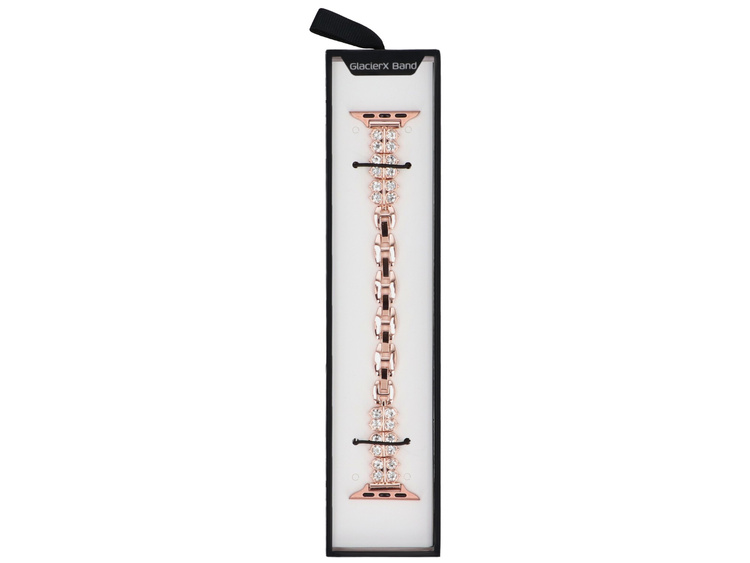 Řetízkový náramek GlacierX určený pro Apple Watch 38/40/41mm. Barva zlatá, zdobený zirkony. Délka nastavitelná čtyřmi rozepínacími články. Produkt nový, zabalený v originálním obalu.