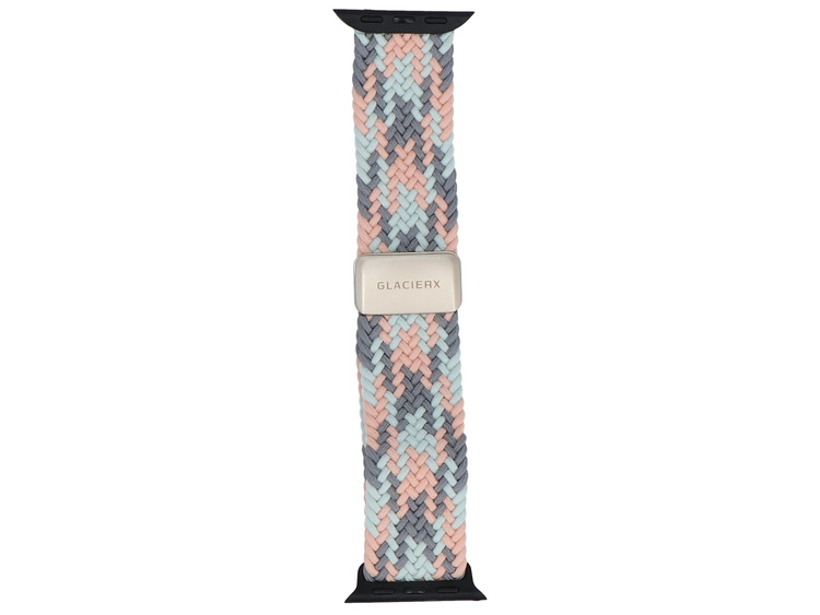 Pletený pásek GlacierX, určený pro Apple Watch 38/40/41mm. Díky magnetickému zapínání a vysoké elasticitě pásku je možné přesné přizpůsobení na zápěstí. Produkt nový, barva mátově-růžová Mint Candy.