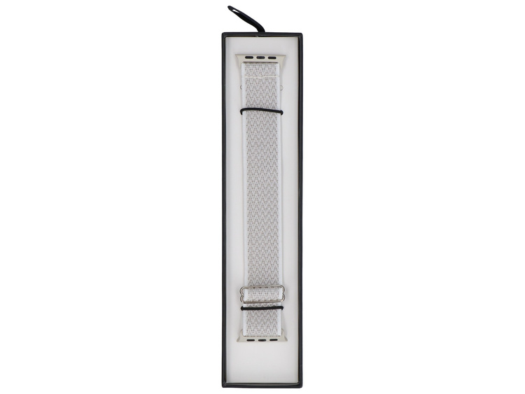 Pletený pásek GlacierX, určený pro Apple Watch 38/40/41mm. Vysoká elasticita materiálu a použitý regulátor umožňují přesné přizpůsobení pásku k zápěstí. Produkt nový, barva světle šedá Frost Gray.