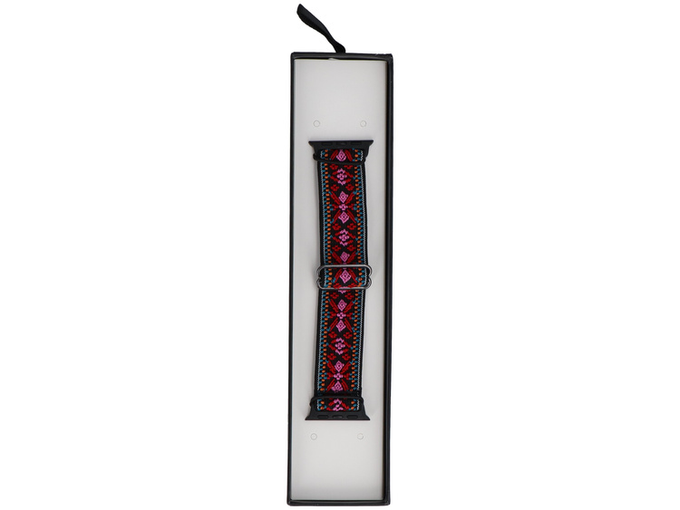Nylonový pásek GlacierX, určený pro Apple Watch 38/40/41mm, ve vzorovaném, orientálním stylu. Mnohobarevný s dominantními barvami růžovou a červenou.
