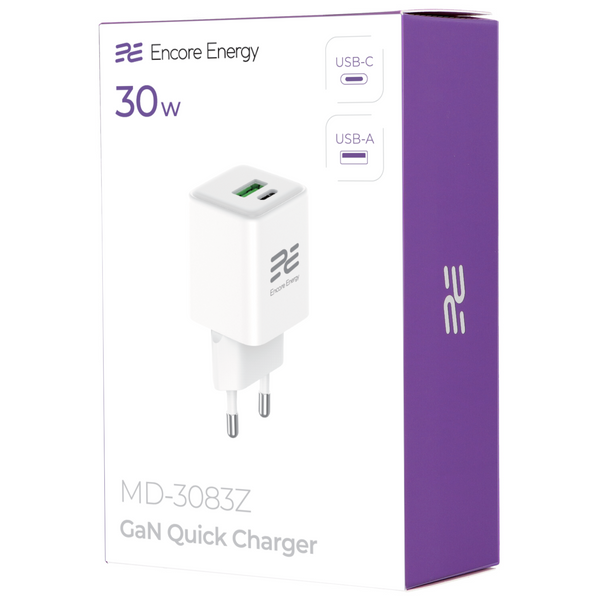 Síťová nabíječka Encore Energy se dvěma porty: USB-A a USB-C. Napájecí zdroj s technologií GaN a standardy nabíjení: PD, QC, BC, AFC, FCP, SCP, Apple 5V/2.4A. Maximální výkon 30W. Sada s kabelem Encore Energy USB-C 1m.