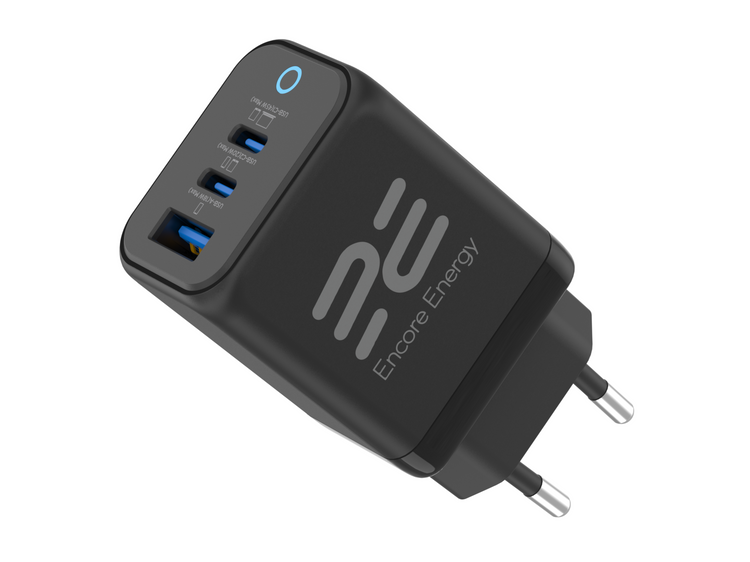 Síťová nabíječka Encore Energy GaN se třemi porty: USB-A a USB-C x 2. Kompaktní napájecí zdroj podporující nabíjecí standardy: PPS, PD, QC, BC 1.2, AFC, FCP, SCP, Apple 5V/2.4A. Maximální výkon 45W.