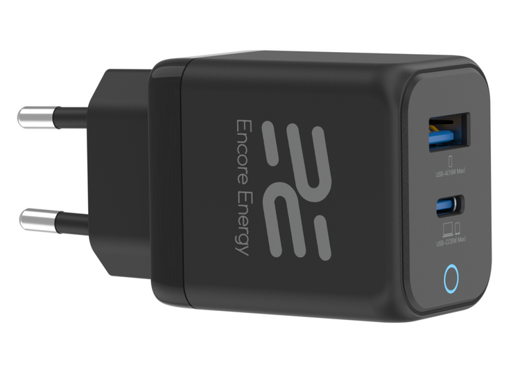 Síťová nabíječka Encore Energy GaN typu dual port USB-A USB-C. Napájecí zdroj se dvěma porty pro nabíjení různých typů zařízení. Podporuje nabíjecí standardy: PPS, PD, QC, BC 1.2, AFC, FCP, SCP, Apple 5V/2.4A. Maximální výkon 35W.