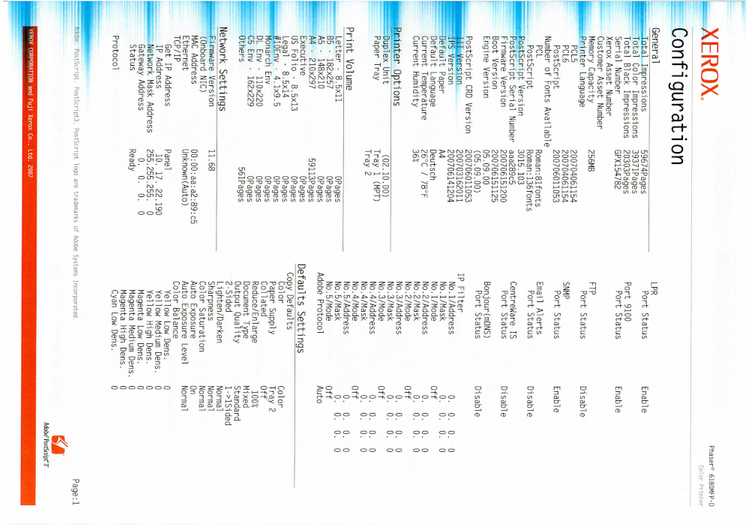 Tiskárna po pronájmu s 60 000 najetými stránkami. Dochází černý toner, špiní výtisky modrou barvou, jak je vidět na fotografii. Ukázkové fotografie.