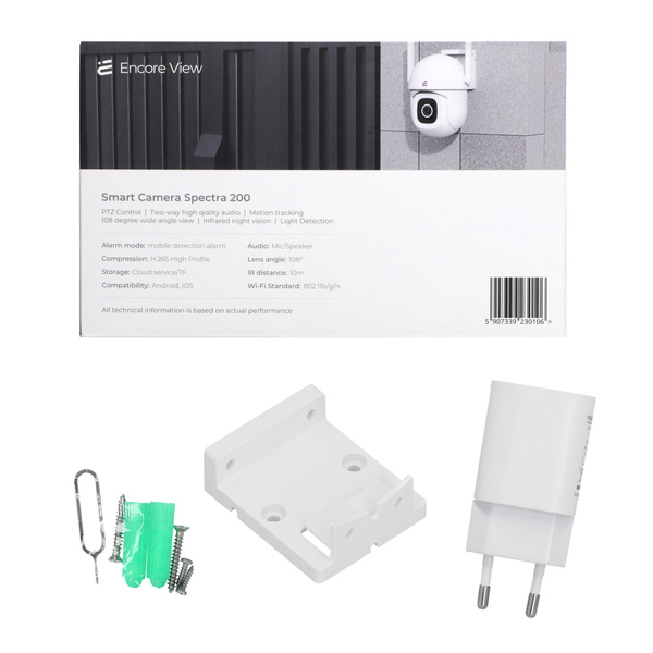 Intelligente Kamera Encore View für den Außenbereich, gesteuert über eine App. PTZ-Gerät mit Funktionen wie Bewegungserkennung, Gegensprechfunktion, Nachtsicht und Alarm. Schutzart IP65. Integriertes Kabel 230 cm. Set mit 64 GB microSD-Karte.