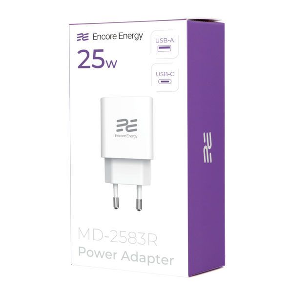 Netzteil Encore Energy mit zwei Anschlüssen: USB-A und USB-C. Ladegerät mit GaN-Technologie und Lade-Standards: PD, QC BC 1.2, AFC, FCP, SCP, Apple 5V/2.4A. Maximale Leistung 25W. Set mit Encore Energy USB-C / -A Kabel, Länge 200 cm.