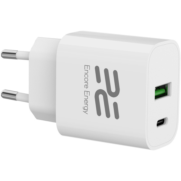 Encore Energy Netzteil mit dualem USB-A und USB-C Anschluss. Schnellladetechnologien: PD 3.0, QC 2.0 3.0 4.0, BC 1.2, AFC, FCP, Apple 5V/2.4A. Maximalleistung USBC 20W, USBA 18W, USBA + USBC 15W. Set mit Encore Energy USB-C Kabel x2 50 cm.