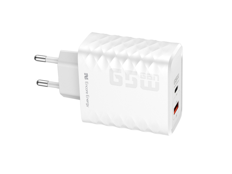 Encore Energy Netzteil mit zwei Ports: USB-A und USB-C. Ladegerät mit GaN-Technologie und Lade Standards: PD 3.0, QC 2.0 3.0 4.0, 4.0+, BC 1.2, AFC, FCP, SCP, Apple 5V/2.4A. Maximale Leistung 65W.