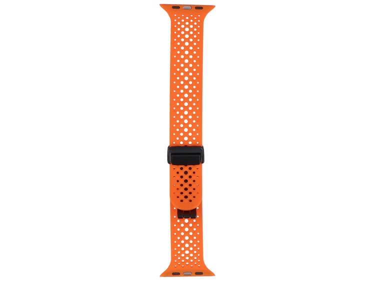 Silikonarmband GlacierX, speziell für Apple Watch 42/44/45/49mm, mit Lochmuster. Magnetischer, gleitender Verschluss ermöglicht eine präzise Anpassung am Handgelenk. Produkt neu, Farbe leuchtendes Orange.