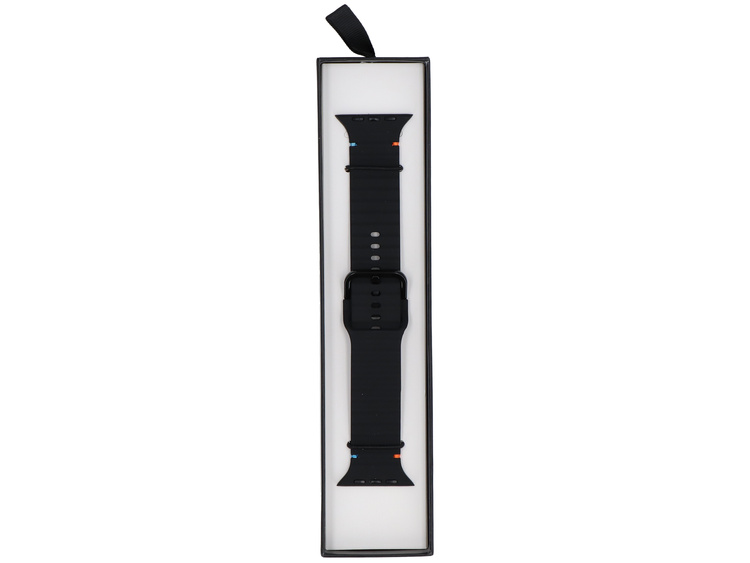 Silikonarmband GlacierX, der für die Apple Watch 42/44/45/49mm mit einer klassischen Schnalle in der Farbe des Armbands geeignet ist. Schwarz mit einer auffälligen gestreiften Textur.
