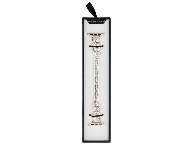 Die Gliederarmband GlacierX ist für die Apple Watch 38/40/41mm geeignet. Farbe Silber, verziert mit Zirkonia. Die Länge ist durch vier abnehmbare Glieder verstellbar. Produkt neu, verpackt in der Originalverpackung.