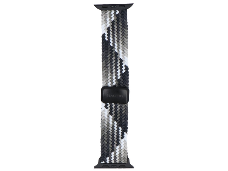 Geflochtenes Band GlacierX, speziell für Apple Watch 42/44/45/49mm. Dank des magnetischen Verschlusses und der hohen Flexibilität des Bands ist eine präzise Anpassung an das Handgelenk möglich. Produkt neu, Farbe schwarz-weiß meliert Ebony Mosaic.