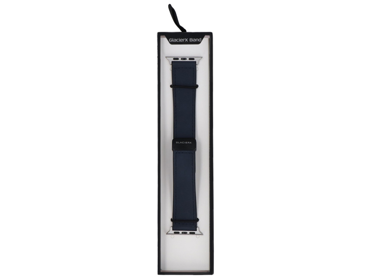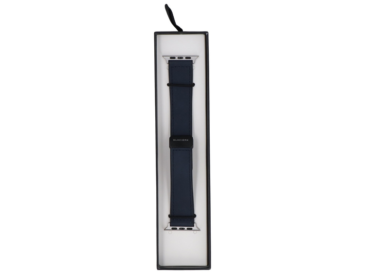 Lederarmband GlacierX, speziell für die Apple Watch 42/44/45/49mm. Mit einer magnetischen, klappbaren Schnalle versehen, bildet es mit der Uhr eine durchgehende Schleife und schützt sie vor versehentlichem Abrutschen. Neues Produkt, Farbe Mitternachtsblau
