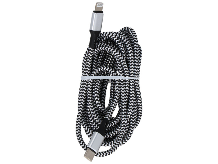 USB-C - Lightning Kabel Encore Energy. Langes, flexibles Kabel mit Nylonummantelung, unterstützt den PD-Standard und eine Leistung von bis zu 27W. Für schnelles Laden und Datenübertragung (bis zu 480 Mbps). Länge 3 m, schwarz-weiß. Bezeichnung EE118-CL.