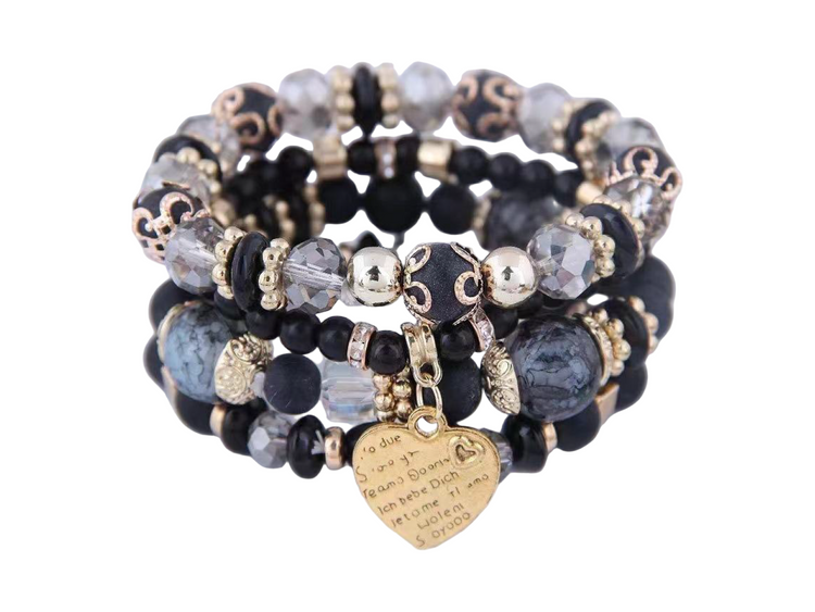 Charms – a set of four flexible bracelets with black beads and gold accents. The central detail is an aged gold heart-shaped charm that adds a romantic character to the bracelets.