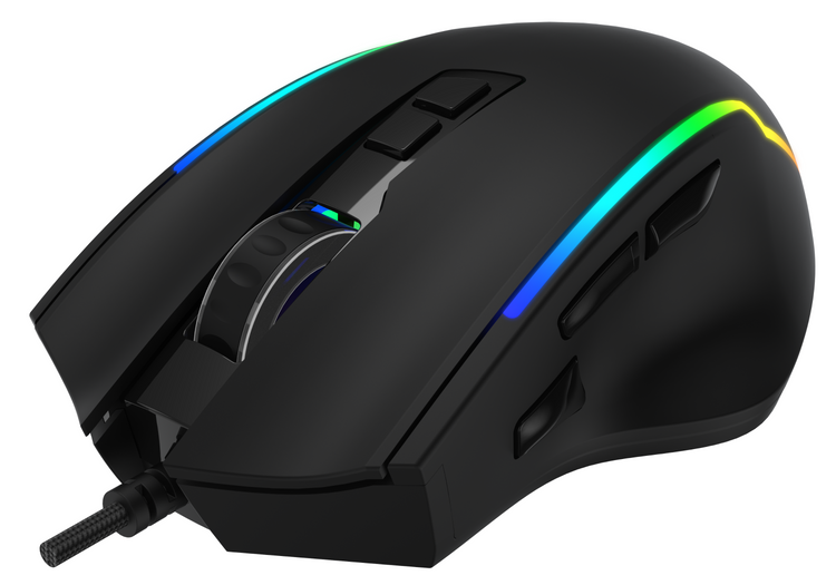 Gaming mouse Triadyn DEIMOS with Instant A825 sensor and a resolution of up to 12800 DPI. 8 buttons, dynamic RGB backlighting, HUANO switches, and a braided USB cable ensure precision and reliability in every game.