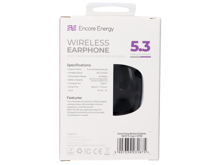 Wireless headphones Encore Energy TWS BT 5.3 HiFi sound, range up to 10m. The capacity of the headphones is 50mAh, providing 3-5 hours of operation, charged in a case with a capacity of 230mAh (USB-C). They can be used in pairs or individually. The set in