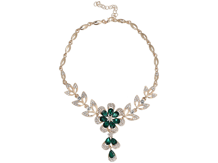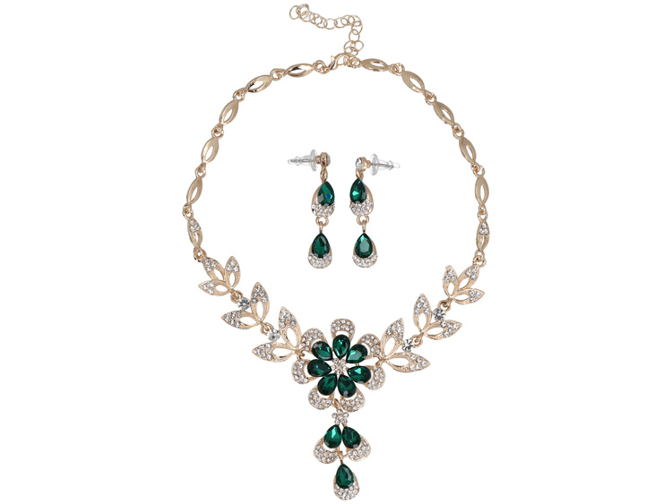 Jewelry set where fantasy meets elegance. The necklace delights with an intricate composition of elements arranged in the shape of leaves, leading to a central point — a large floral motif. The set is completed by stud earrings.