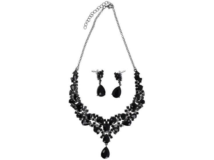 Jewelry set in silver color, decorated with layered black zircons in various sizes. Stud earrings and a necklace - collar, fastened with a lobster clasp, create a set that becomes the focal point of the styling.