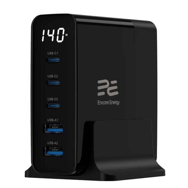New Encore Energy charging station desktop charger GaN QC 4+ 5.0 PD 3.0 USB-A x2 USB-C x3 140W GaN-14083R with display + 2m USB-C cable