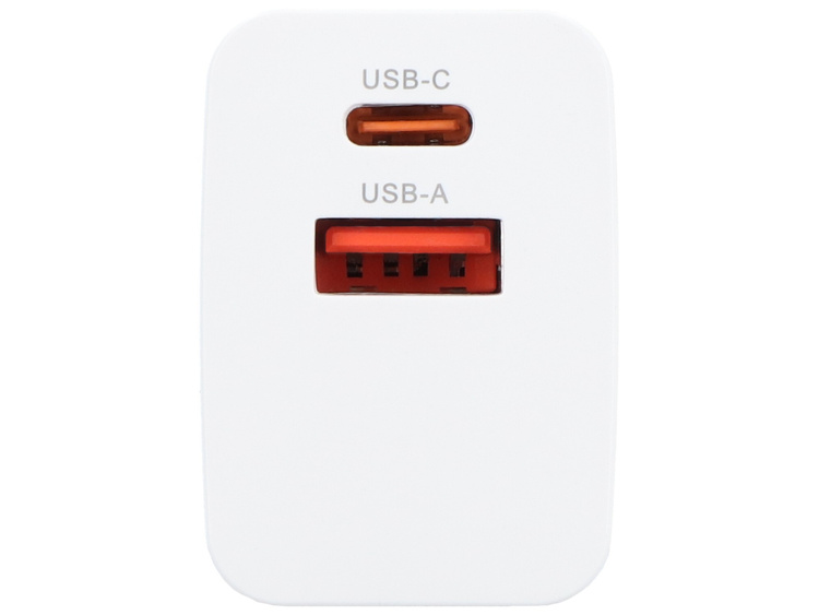 Encore Energy wall charger with two ports: USB-A and USB-C. Power adapter with GaN technology and charging standards: PD, QC BC 1.2, AFC, FCP, SCP, Apple 5V/2.4A. Maximum power of 25W. Set includes Encore Energy USB-C cable x2 50 cm.