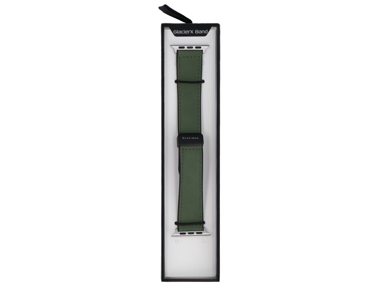 GlacierX leather strap dedicated to Apple Watch 42/44/45/49mm. Fastened with a magnetic, foldable clasp, it creates an uninterrupted loop with the watch, securing it against accidental slipping off the wrist. Product new, color green Stone Green.