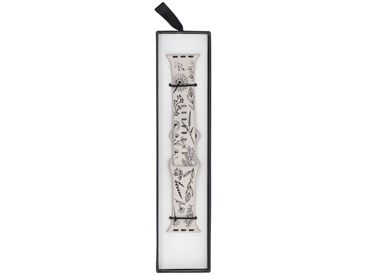 GlacierX silicone strap, dedicated to Apple Watch 38/40/41mm, with a pin buckle. Color of broken white with a floral black pattern.