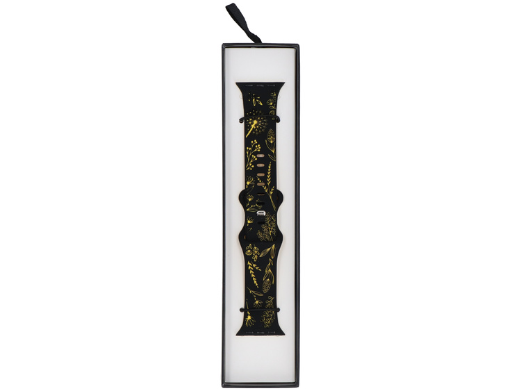 GlacierX silicone strap, dedicated to Apple Watch 38/40/41mm, with a pin buckle. Black with a floral yellow pattern.