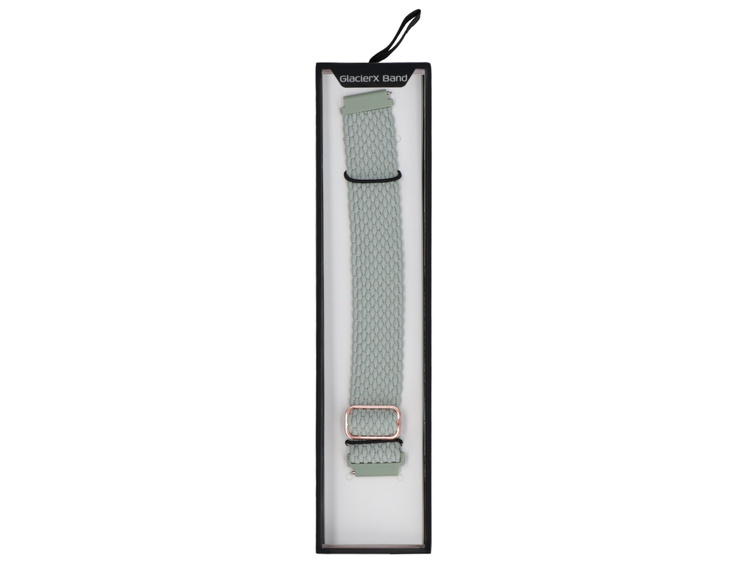 Nylon strap for GlacierX smartwatch in sage green color. New product, packaged in original packaging. Width 20 mm, length adjustable with a sliding buckle.