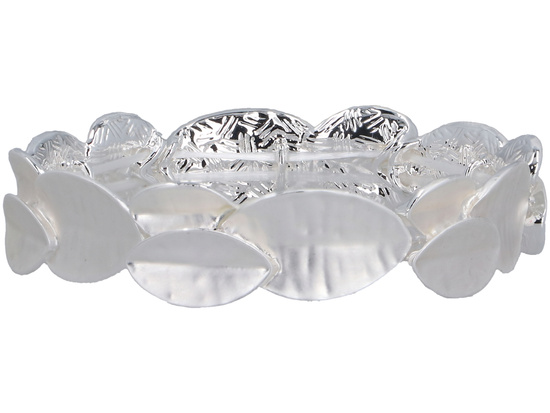 Flexible bracelet in silver-white color, made of leaf-shaped elements in various sizes. Delicate and full of charm, it serves as a subtle color accent that harmoniously complements both everyday and more elegant outfits.