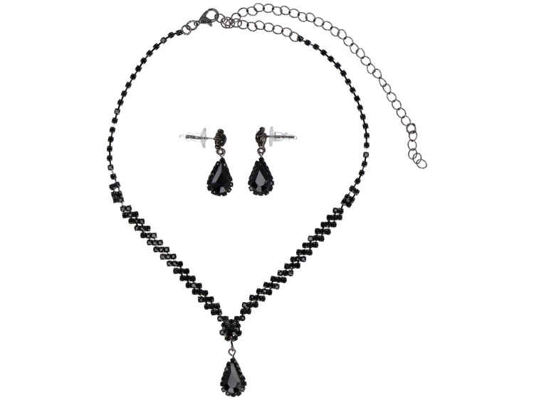 Victorian is a richly decorated set, consisting of a necklace and earrings, with a large stone surrounded by smaller zircons as the focal point. Perfect for special occasions, striking and full of sparkle, the set is in black.