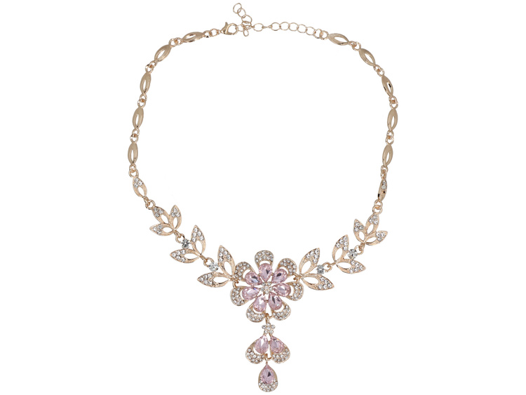 Conjunto de joyas donde la fantasía se encuentra con la elegancia. El collar deslumbra con su intrincada composición de elementos dispuestos en forma de hojas, que conducen a un punto central: un gran motivo floral. Los pendientes de botón complementan el