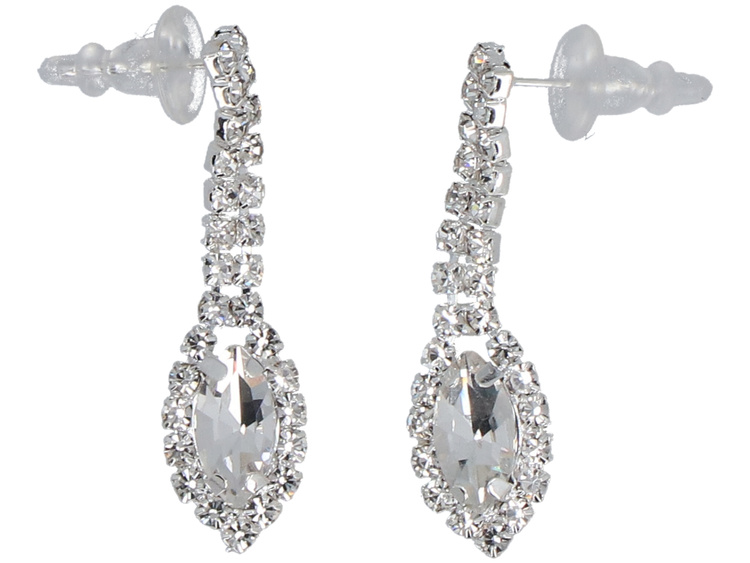 Encantadora es una joyería que atrae miradas con su brillantez intensa. Pendientes de botón, en conjunto con una pulsera y un collar con una fila de grandes circonitas, sutilmente rodeadas de piedras más pequeñas. Color plateado.