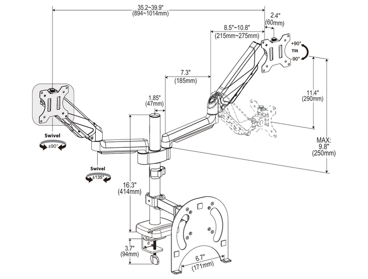 Nuevo Soporte de Escritorio Triadyn TriMount para Dos Monitores y Laptop Ergonómico Ajustable Rotatorio TRD-BLK-3AL-13"-32"