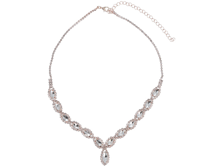 Encantadora es una joyería que atrae miradas con su brillo intenso. Pendientes de botón, junto con una pulsera y un collar con una fila de grandes circonitas rodeadas de piedras más pequeñas. Color oro rosa.
