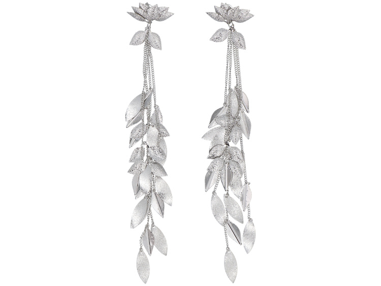 Alegría – pendientes largos en color plata, compuestos por hojas ovaladas suspendidas en cadenas. La construcción en cascada les da ligereza y una sensación de movimiento, y la superficie texturizada hace que brillen sutilmente, reflejando la luz de maner