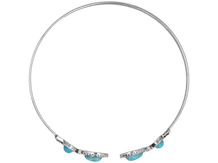 Retro - pulsera rígida para el brazo de estilo vintage. Tiene una forma ovalada característica de décadas pasadas. La decoración central está formada por piedras turquesas en engastes con bordes decorativos, que recuerdan la artesanía de los antiguos joye
