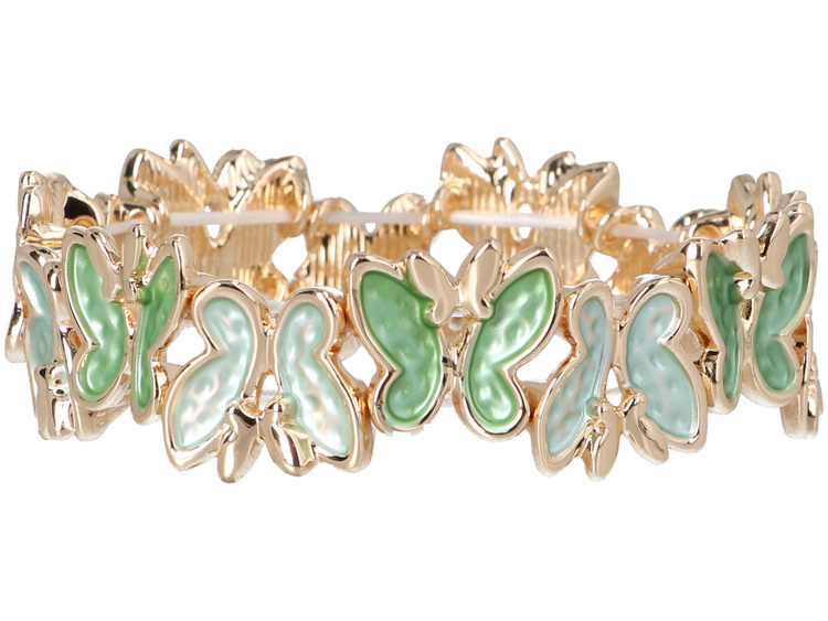 Pulsera flexible en color dorado, construida a partir de segmentos en forma de mariposas, con un relleno verde tipo esmalte. Es un accesorio encantador y versátil que añade ligereza y un toque colorido a cualquier estilo.