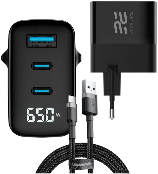 Cargador de pared nuevo Encore Energy GaN QC 4+ PD 3.0 USB-A USB-C x2 65W con pantalla Cargador USB rápido + Cable USB Baseus 2m