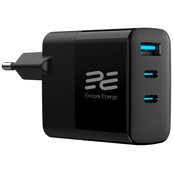 Cargador USB rápido Encore Energy con tres puertos: USB-A y 2x USB-C y una pantalla. Adaptador de corriente con tecnología GaN y tecnologías de carga rápida: PD 3.0, QC 2.0 3.0 4.0 4.0+, BC 1.2, AFC, FCP, SCP, Apple 5V/2.4A. Potencia máxima 65W.