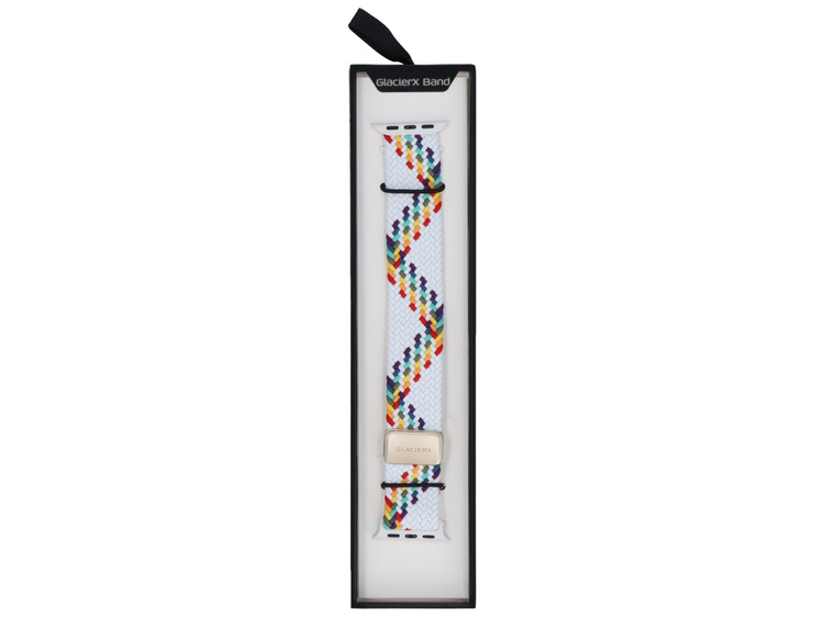 Cinturón trenzado GlacierX, dedicado a Apple Watch 38/40/41mm. Gracias al cierre magnético y a la alta elasticidad del cinturón, es posible ajustarlo con precisión a la muñeca. Producto nuevo, color blanco-arcoíris Prism Stripes.