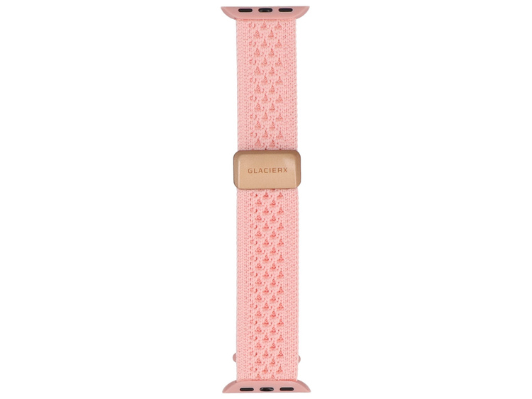 Correa de nylon GlacierX, dedicada a Apple Watch de 38/40/41 mm. Gracias al cierre magnético y deslizante, permite un ajuste preciso a la muñeca. Producto nuevo, color rosa con textura decorativa.